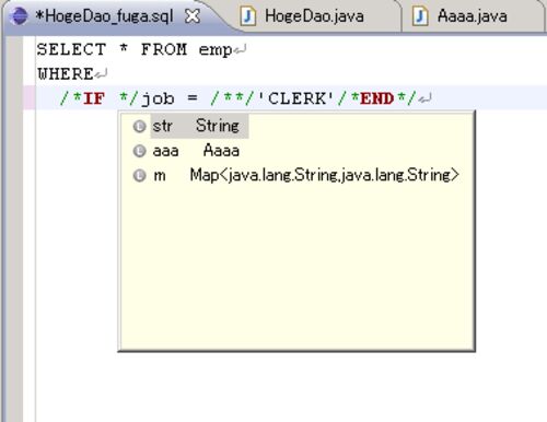 こんなDaoを用意しるます。 package org.examples; import java.util.Map; public interface HogeDao { String fuga(String str, Aaaa aaa, Map<String, String> m); } 同じパッケージに、S2Daoと同じルールでSQLファイルを用意しるます。 org/examples/HogeDao_fuga.sql み</string,>…